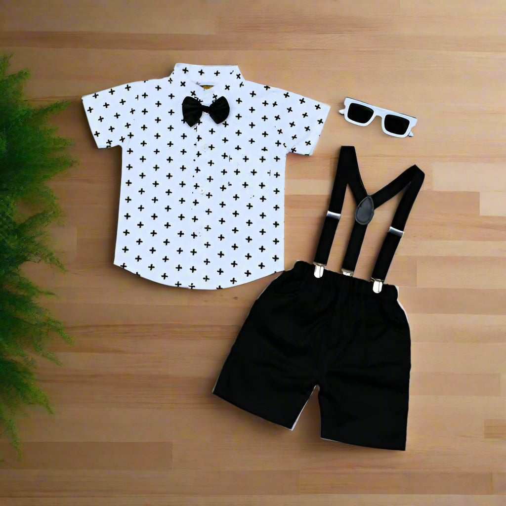 Dress your little one in this adorable and trendy 2-piece set featuring a half-sleeve shirt with bow tie and suspender set shorts. The bow tie is detachable, giving you versatile styling options. This fine-quality cotton set is perfect for any special occasion, including parties, weddings, Eid, and festivals. The shirt and shorts are crafted from soft, breathable cotton, making it an ideal summer outfit for your baby boy.