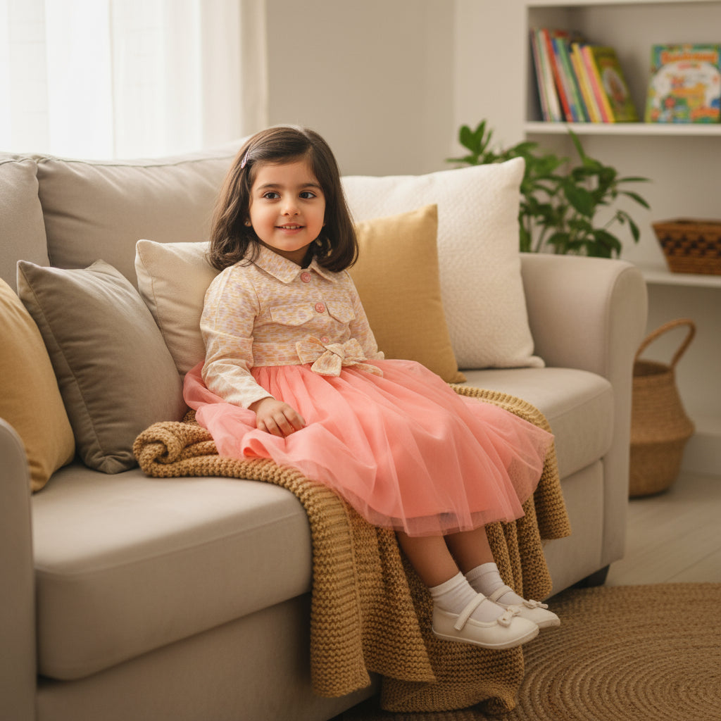 Front buttons, belted with stylish pocket patches with collar. This beautifully designed dress offers eye catching color contrast of peach and gold.