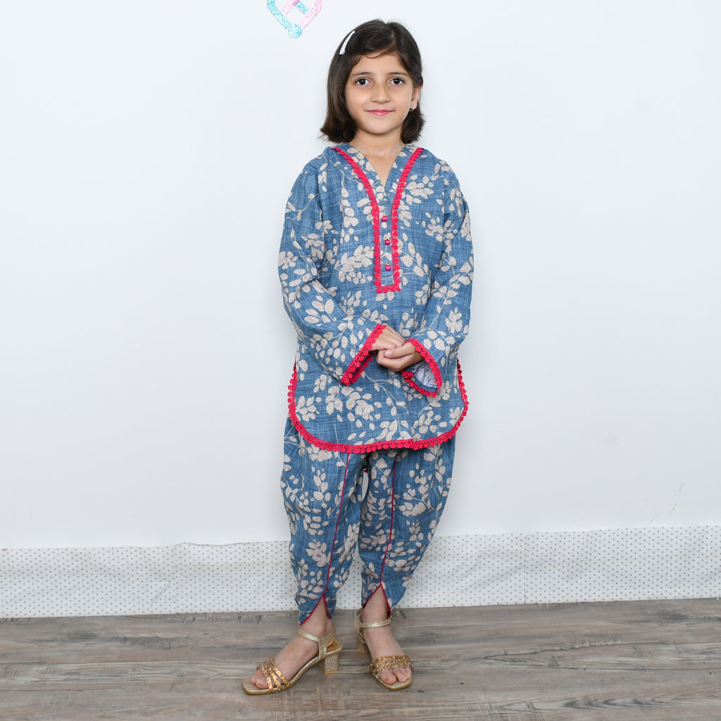 Beautiful Floral Print Embellished with Lace. Short front and backtial style. Dhoti Style Shalwar which gives it...