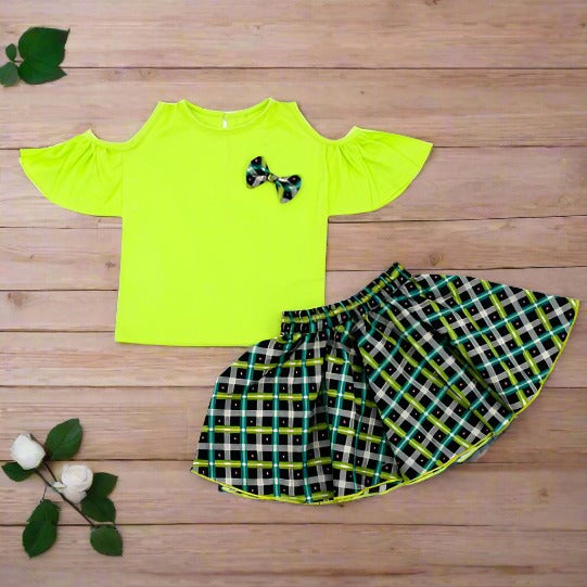 Cold Shoulder Top & Checkered Skirt 2 Piece Girl Dress Set