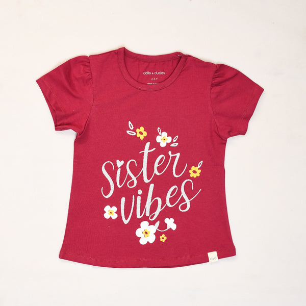 Girl Half Sleeves Cherry Red Round Neck Sister Vibes T Shirt