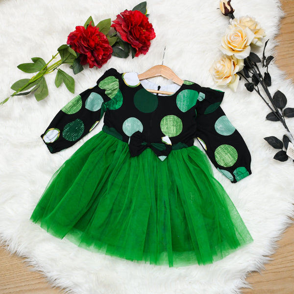 Let your little one shine in vibrant cool style with our Gorgeous Polka Dots Print Girl Dress. This eye-catching piece features a beautifully patterned print bodice with long sleeves, paired perfectly with a bright green tulle skirt that adds a playful, princess-like flair.