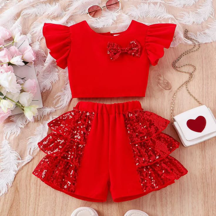 Charming Design: Features a soft, ruffle-sleeved top paired with a shorts adorned with side ruffle sequin embellishments, adding a touch of sparkle and playfulness.