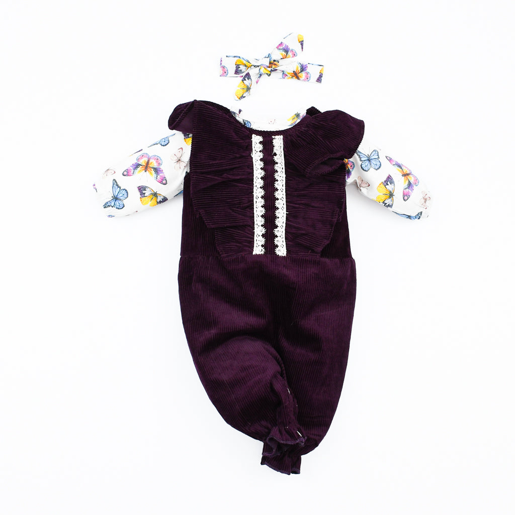 Ruffle trim corduroy jumpsuit, butterfly print khaddar top and matching tie knot headband. Jumpsuit has buttons at...