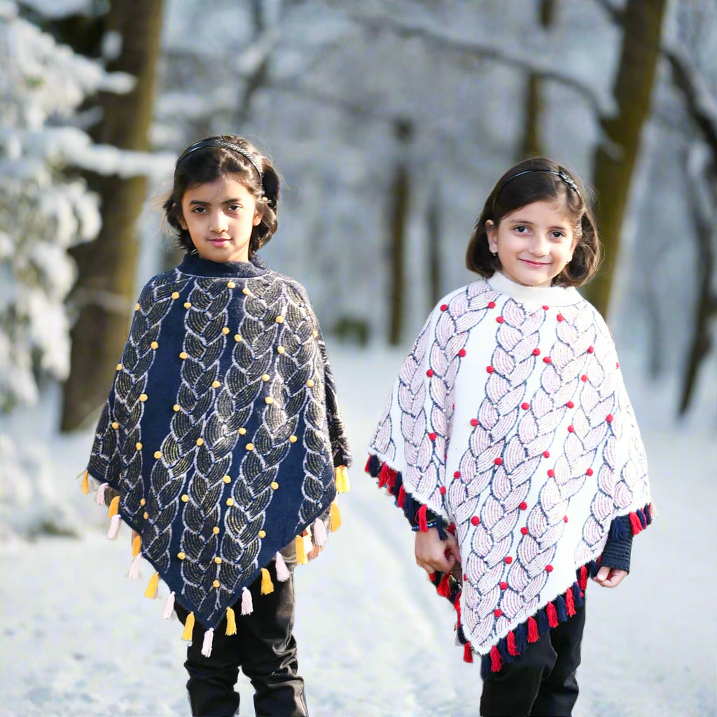 Girls Cape Shawl with punched pearls. High Neck style. It comes with wool ball beads and wool...
