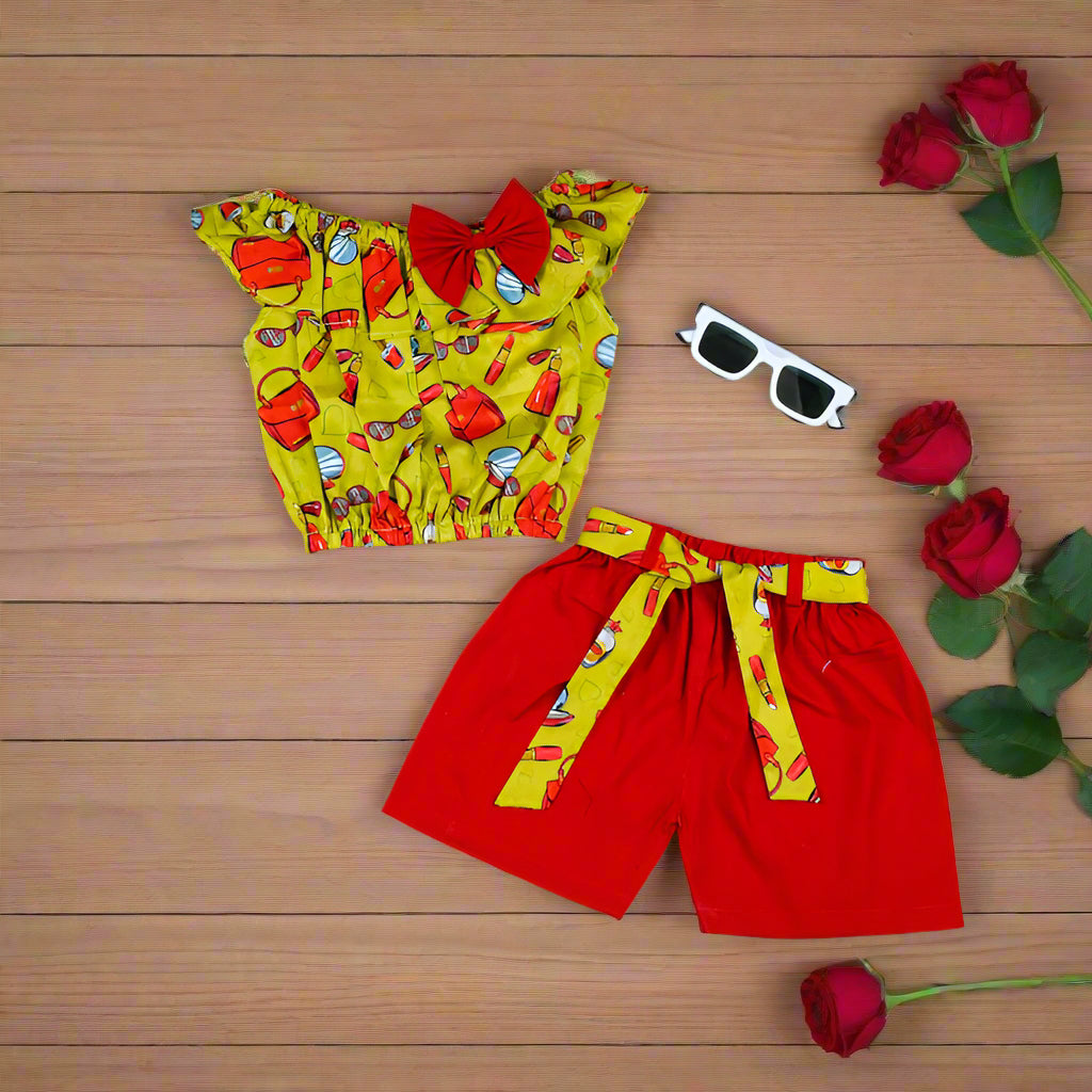 Vibrant Print Off Shoulder Top & Belted Shorts Set – Perfect for Summer Outings